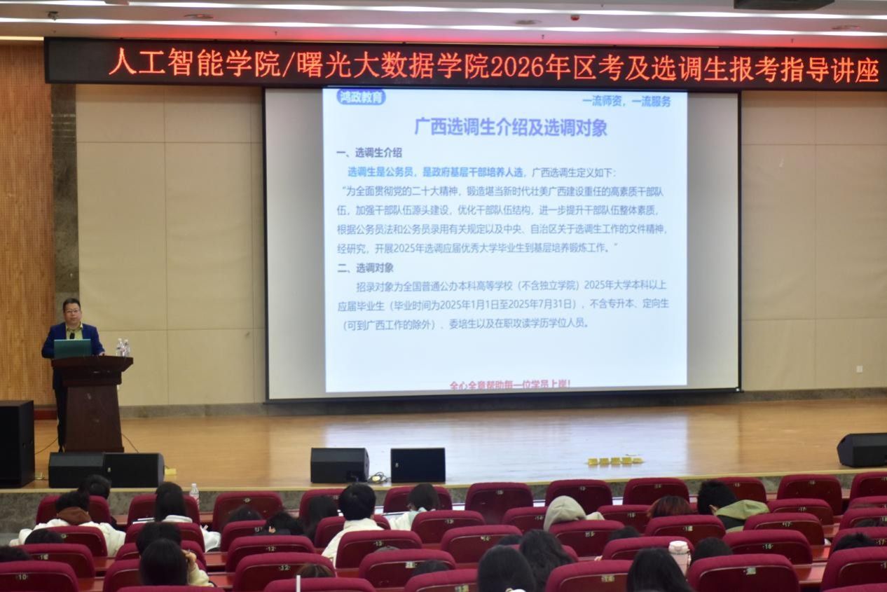 为帮助学生了解公职招录政策,科学规划备考,12月4日,人工智能学院在图书馆报告厅举办2026年广西区考及选调生报考指导讲座。讲座特邀鸿政教育资深讲师宋秉桂主讲,学院共计370余名学生参加。