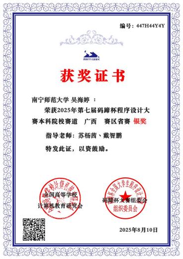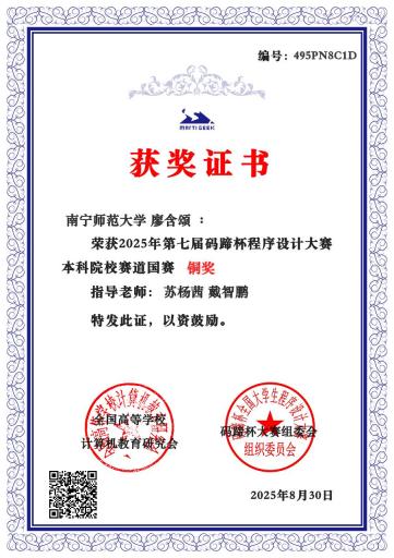 9月26号,由全国高等学校计算机教育研究会主办、高校计算机教学与产业实践联盟承办的2025年“码蹄杯”全国程序设计大赛圆满落幕。在苏杨茜、戴智鹏等老师的组织指导下,人工智能学院30名学生经过省赛和国赛的激烈角逐,最终荣获全国铜奖1项,省赛金奖2项、银奖4项和铜奖2项的佳绩。