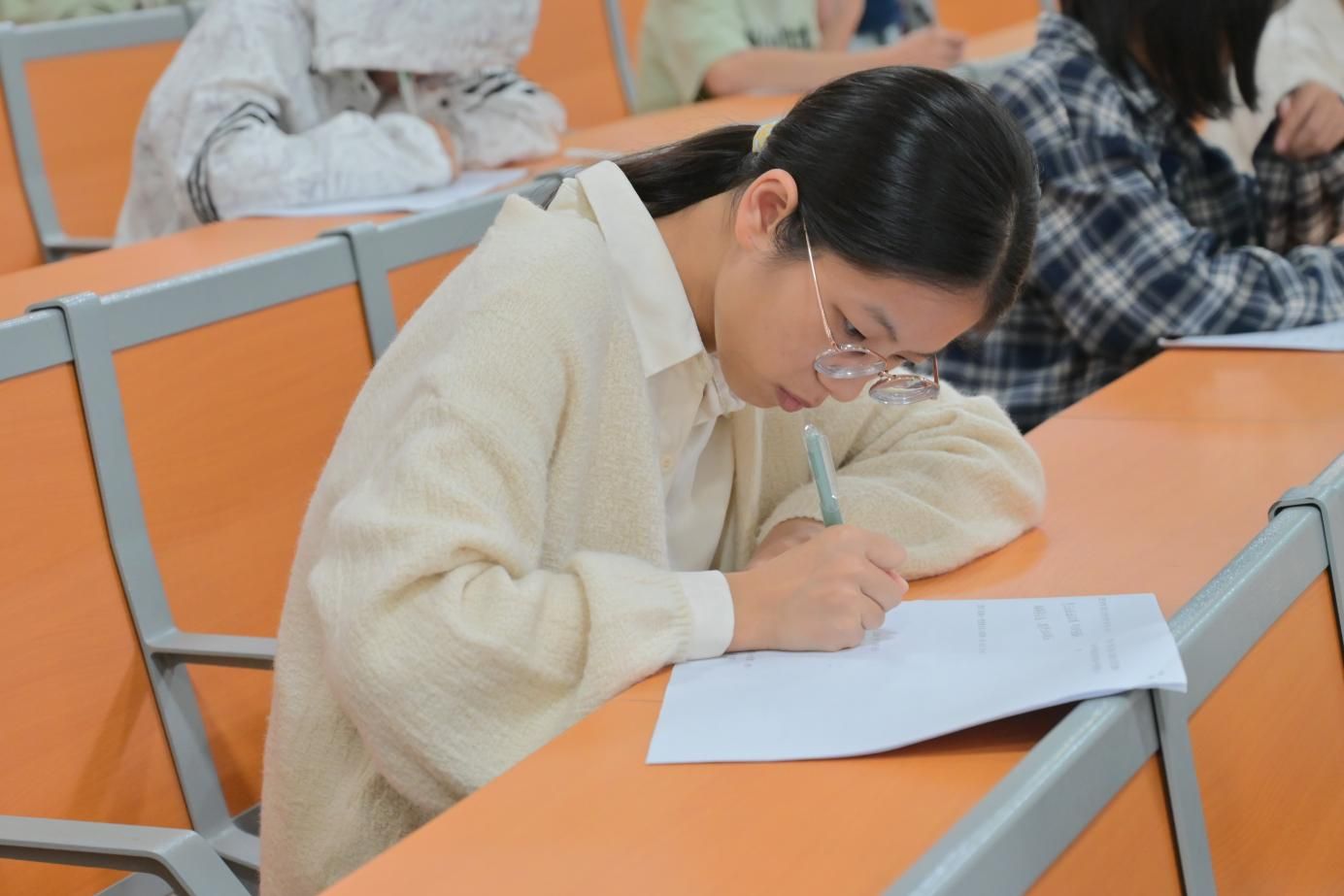 本次比赛采用笔试形式,内容涵盖了诗词众多方面,题型包括选择题、默写题以及原创诗题等。其中,原创诗题要求结合“中秋赏月的思念与团圆”创作小诗,既考察文学创作功底,又展现传统诗词的格律之美。比赛现场秩序井然,氛围紧张焦灼。选手们或快速作答,或停笔深思,草稿上写满了推敲的痕迹。这份全神贯注,让整个赛场充满了思维的张力。经评审,25软件班范梓筠、24教技班汤晓玲、24教技班胡雅捷三位选手脱颖而出,荣获本次比赛一等奖,将代表学院参加校级复赛。