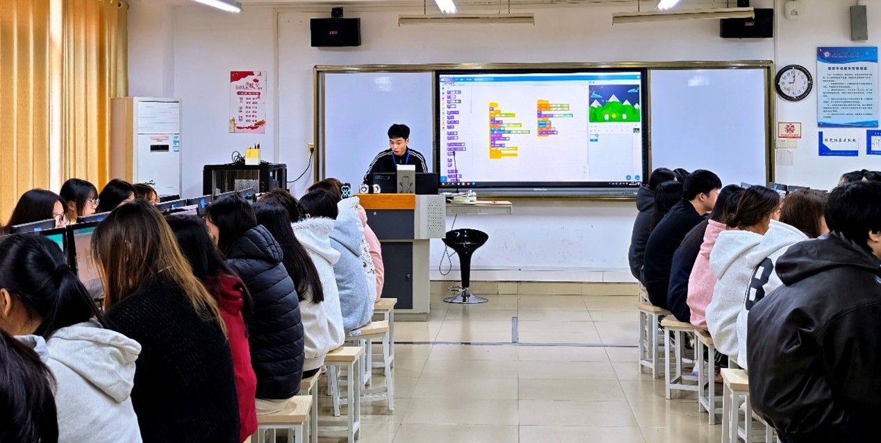在随堂听课环节,教师们观摩了实习生韦鑫讲授的《中小学创客教育》课程。韦鑫以“炫彩烟花”和“一起来绘画”为核心案例,通过情境引入、案例解析、分步实操、自主创作等教学环节,引导学生掌握Scratch编程中的克隆技术和绘画工具使用,展现出扎实的专业功底和良好的课堂组织能力。