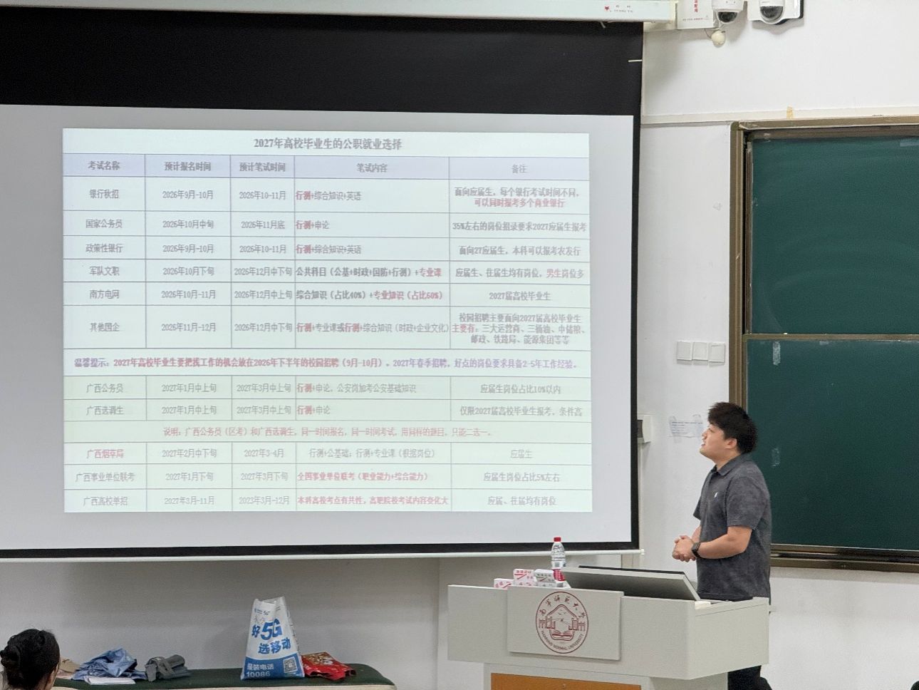 3月17日,人工智能学院在武鸣校区武1-214教室举办公职就业指导分享会。讲座特邀中公教育肖钧泽老师主讲,100余名学生参加。