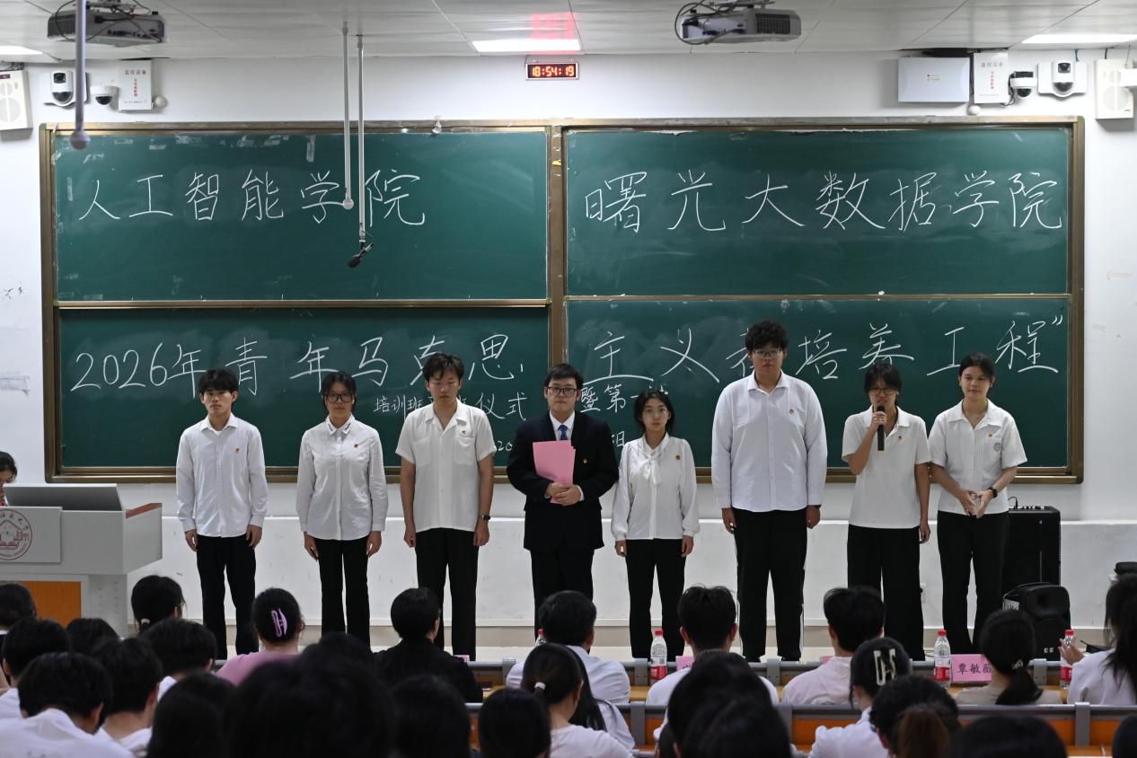 仪式伊始,全体肃立,在团歌声中重温入团誓词。随后,韦柳温在致辞中强调开班的目的和意义,并对全体学员提出三点希望。一是筑牢信仰根基,做“心中有光”的AI青年。她指出,技术是中性的,掌握技术的人必须有鲜明的政治立场,让AI技术成为服务人民需求的“暖科技”。二是练就过硬本领,做“手中有术”的AI先锋。她强调,信仰需要实力支撑,要发扬“理论联系实际”的学风,把论文写在祖国大地上,把模型用在人民需要处。三是勇担时代重任,做“肩上有责”的AI栋梁。她表示,同学们要带头思考“科技向善”的内涵,坚守学术道德,维护数据安全与用户尊严。随后,学员代表钟浩瑜表示,新时代青年要用坚定的政治信仰、过硬的作风和全面的素质,在强国建设征程上继续奋斗。